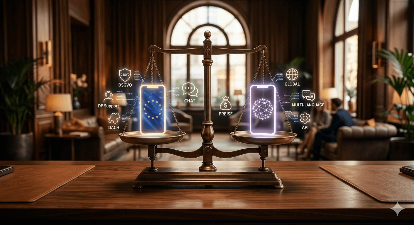 Aber für unabhängige Hotels in Österreich, Deutschland und der Schweiz – inhabergeführt, 30 bis 120 Zimmer, deutschsprachig, datenschutzbewusst, ohne IT-Abteilung – ist Duve in mehreren entscheidenden Punkten nicht optimal ausgerichtet. DSGVO-Architektur, lokaler Support, Preisniveau für kleinere Häuser und Onboarding-Aufwand sind konkrete Einschränkungen, die im Sales-Prozess oft erst spät sichtbar werden.