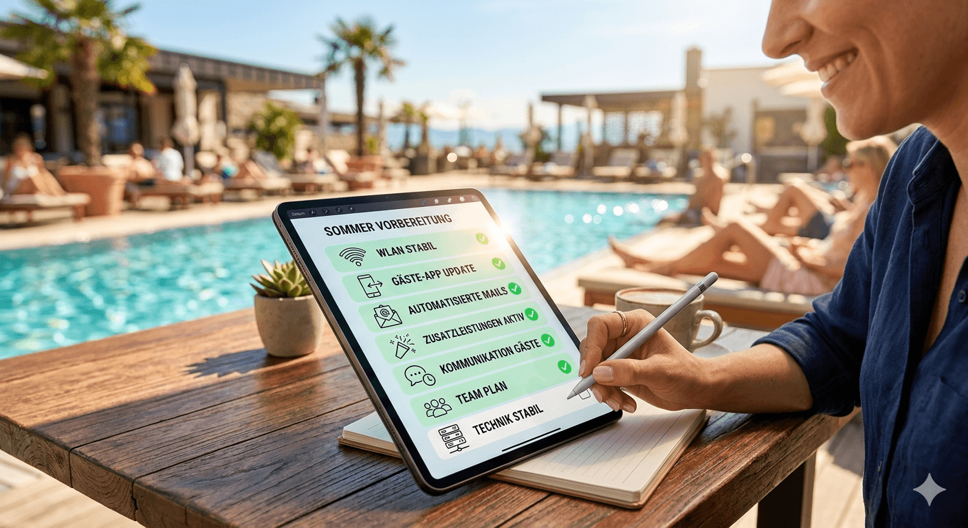 Mitte April. Die ersten Sommerbuchungen sind seit Wochen im System. Die Auslastung für Juni, Juli, August sieht gut aus – besser als letztes Jahr sogar. Und trotzdem: Irgendwo im Hinterkopf sitzt das leise Unbehagen, das jeden Hotelier vor der Hochsaison kennt. Reicht das Team? Läuft die Technik stabil, wenn gleichzeitig 90% der Zimmer belegt sind? Werden die Zusatzleistungen aktiv genug beworben? Kommt die Kommunikation mit den Gästen rechtzeitig an? Die Sommersaison verzeiht keine halben Vorbereitungen. Was im Herbst noch als "Wir schauen mal" durchgeht, wird im August zur Betriebsstörung. Dieser Artikel ist eure digitale Vorbereitungs-Checkliste – strukturiert nach den Bereichen, in denen Digitalisierung den größten Unterschied macht, wenn das Haus voll ist und das Team am Limit läuft. Nicht als theoretischer Überblick, sondern als praktische Schritt-für-Schritt-Liste, die ihr jetzt, in den Wochen vor dem Sommer, abarbeiten könnt.